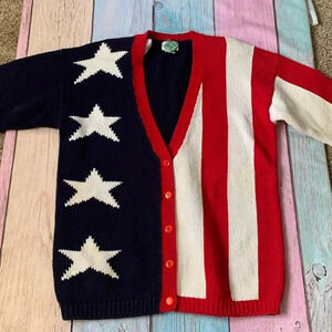 Vintage casual corner 100% cotton American flag V-neck button up sweater. In great vintage preowned condition. No holes or pools. Will need to be washed. Has a fainted yellowish color on part of the sleeve that I’m sure will come off once washed.