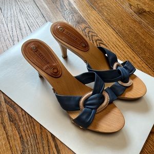 Blue leather wooden slide heels. Sz EU 38, best for US womens 8. Such a unique piece. Great for summer. Very carrie bradshaw-esque. No box. See photos for condition.