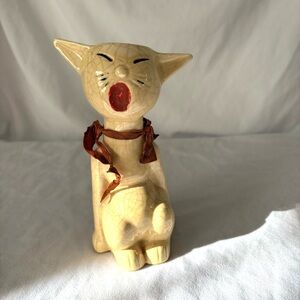 1970s hand painted ceramic vase shaped like a cat with a small opening at the top to hold items or flowers
