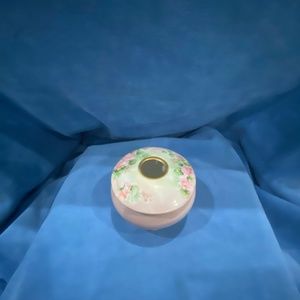 Vintage, Weimar, hand-painted hair receiver, and powder holder, floral design with gold trim, 4” diameter 2 1/2 “ tall, made in Germany, bowls have removable lids, the hair receiver has a hole in center, this can be used for cotton balls, the other could be a trinket or jewelry holder. Both of these pieces are in excellent condition. The third piece is a hand painted ring/ trinket dish with a floral design and gold trim, the floral design matches well with the other 2 pieces. 4 1/4” wide by 3” tall by 3” deep. This piece is numbered 1181, signed C. Veith, MZ Austria. All three pieces are in excellent condition..