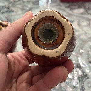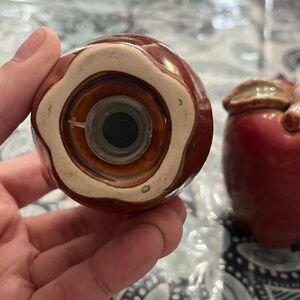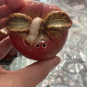 Cute and quirky apple-themed salt and pepper shaker set. Includes two shakers and a serving dish. Like new condition. Each shaker measures 2 1/2" wide and 2 3/4" tall. The dish measures 6 1/2" wide, 6 3/4" long, and about 1 1/4 " deep. No chips, cracks or repairs. Unknown maker and date of manufacture. Would look great on your patio table when you grill out this summer