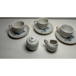 Vintage white miniature children’s tea cups (3) saucers (3) creamer (1) & sugar bowl (1) with blue rose design. Made in Japan