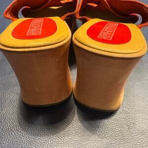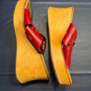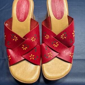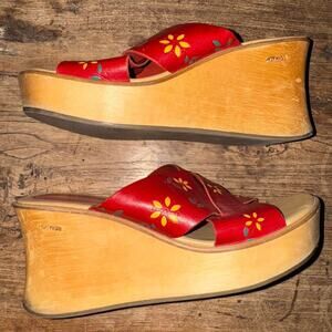 Vintage y2k Hot Kiss red leather chinky platform sandals with a boho vibe painted flowers details