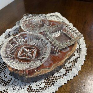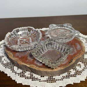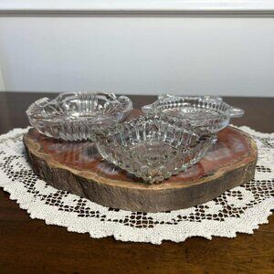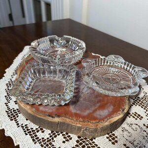 (3) clear glass ashtrays. A 1960’s 4” round Federal Glass Georgetown four slot ashtray with no chips. A 1930’s 4” round Anchor Hocking Queen Mary five slot ashtray with one tiny fleabite. A 2-7/8” square sawtooth edge tray with a chip on one side (see pics). A nice combo!