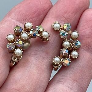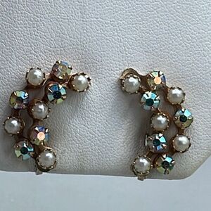 Vintage climber clip style earrings with AB stones and faux pearls.