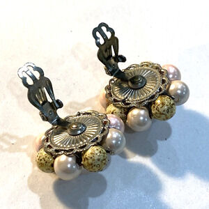 Vintage clip on earrings pink white pearl finish & gold confetti bead clusters