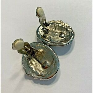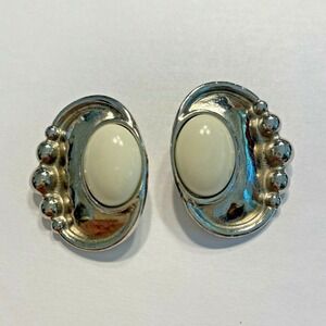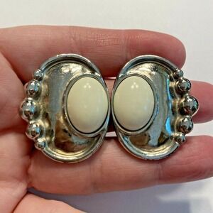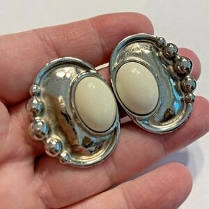Vintage clip on earrings - these are statement making retro look jewelry. Mod silver tone base with organic look - creamy white bead disk centers. Looks like modern art - no hallmarks but these are very nice quality costume jewelry! These are about 1.75" long x 1.25" wide - dimensional and gorgeous. In excellent vintage condition - no damage or flaws - ready to wear.
