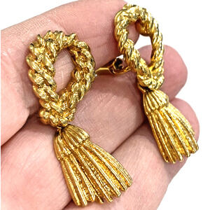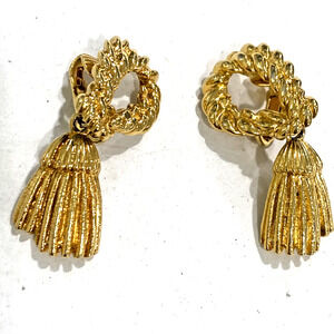 Vintage clip on earrings rope textured dimensional goldtone metal with tassel look dangles. These earrings are classic elegant chic and dressy - perfect for career or date night. No hallmarks but the quality is very nice fashion jewelry. In excellent condition - minimal wear - no damage or flaws.