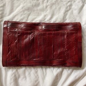 Good condition. One zipper inside is broken. Beautiful maroon leather clutch, bought at a local vintage boutique. Tags: rouje French vintage
