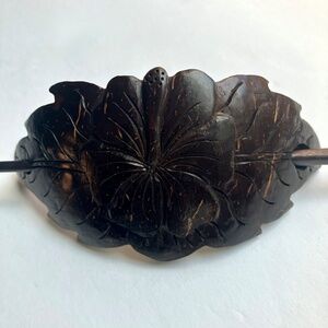 This lovely espresso brown hair pin is carved our of coconut shell. It features a hibiscus flower design with leaves, and comes with a wooden fastener stick. This size will easily accommodate a thick bun or ponytail.