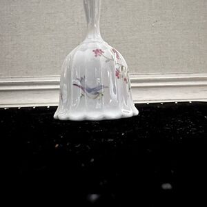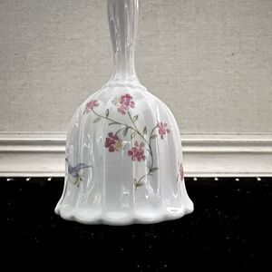 Vintage Spode white china bell with gold trim, pink floral pattern and birds. Detailed ruffled edges. Collectors item. Style number and name. Numbered item. Excellent vintage condition with no chips or cracks.