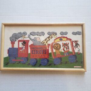 This lovingly made cross stitch piece for "Michael" is framed art of circus train coming to town. Elephant, giraffe, lion, tiger and monkey.