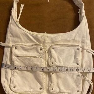 This is a vintage Converse All Star purse made of white pebbled faux leather. The crescent-shaped hobo bag has a zip closure and features grommet, tassel, and zipper accents. It has a medium size with dimensions of 17" width, 12" height, and 12" depth. The white faux leather/leather shoulder strap has white hardware and the lining material is polyester. The product line is Converse and it is designed for casual occasions.