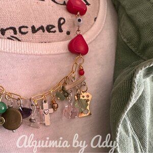 Vintage coral hearts multi stone multi charms gold adjustable necklace