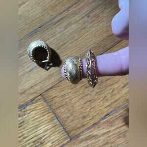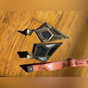 This is a vintage costume jewelry lot containing two pairs of gold tone hoops and a pair of dangling earrings. The first pair of hoops is a chunky huggie style, the second pair are a little larger with cutout shapes. The dangle pair of earrings are from the 80s and are a stud with a hanging triangle shape that has pony hair patches in blue and black. Overall in good vintage condition - some minor patina and wear. Priced accordingly.
