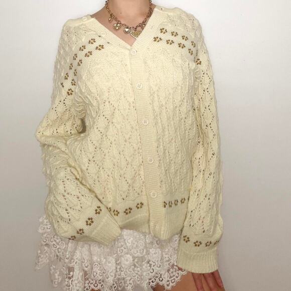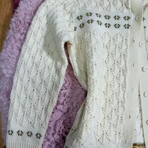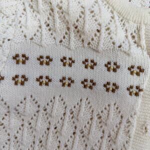 vintage cream cuddle knits 100% acrylic knit sweater with the sweetest little cut out details and floral embroidery across the center. no size tag ptp- 21-27”best for large.