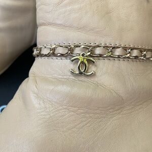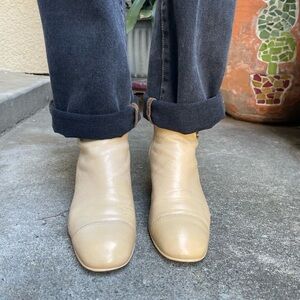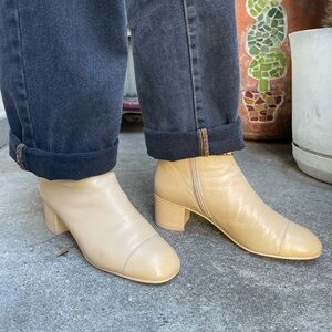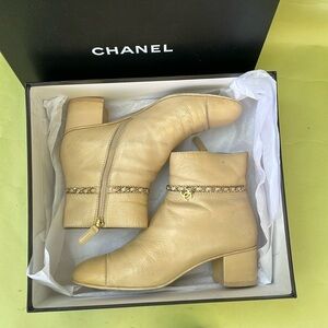 Absolutely gorgeous vintage cream Chanel leather booties with exclusive gold hardware. Great vintage condition, scratches and some discoloration, not that much noticeable. Professionally cleaned and polished. New heel tops just added. Soft leather. Lightweight and comfortable. Leather lining. Heel height is 2”. European size is 41, feels like size 10. Length from toe to heel is 10.5”. Always will be in style. Box included
