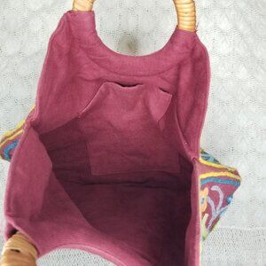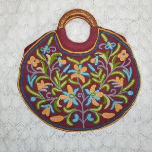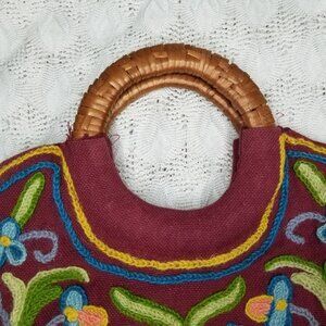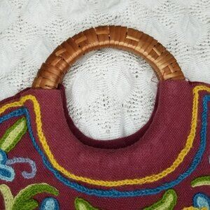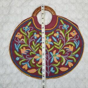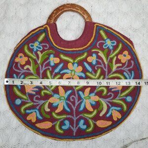 Vintage crewel chain stitch embroidery bag red floral wicker-wrapped handles