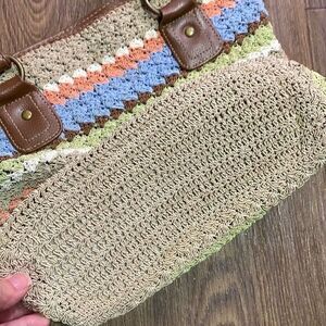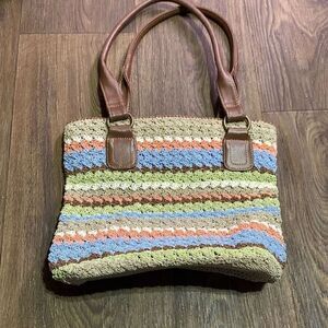 Vintage crochet knit shoulder purse. Earthy colors stripe design hobo retro