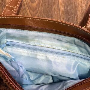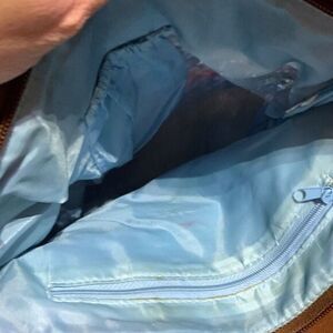 Does have a couple imperfections. Spot on back of bag (pointed out). Inside an imperfection in lining and discolored by zipper , everything pictured.