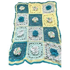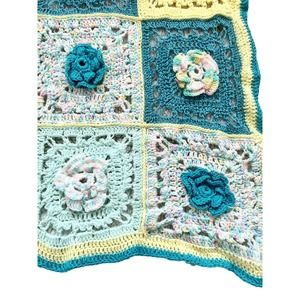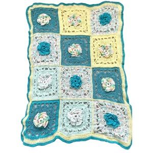 This is a super sweet handmade crocheted baby blanket made with yarn. It is large granny squares with flowers.