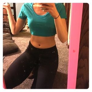 Vintage crop top! S/M Super stretch! Shiny material. It's a bright blue! Gorgeous color! So hard to find. Material is a good thickness and light weight. It's a S/M. (I'm an xs on top and you can see it's a little big on me) no label in it but it's from a vintage store. It shines perfectly in pictures! Perfect 4 summer! Approx measurements: length:14in, shoulder to shoulder hem: 14 1/2, cap sleeve:6 1/2, bust: 13in, bottom hem:11in, neck plunge:5 1/2in. ALL SUPER STRETCH. (Sorry dirty mirror eek)