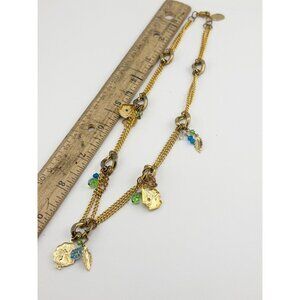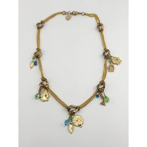 Vintage crystal charm necklace feathers, birdhouse, peacock, Indian chief. Vintage crystal charm necklace. Gold tone chains with hanging crystals and gold tone charms. Vintage necklace with heart closure. MN54MN.