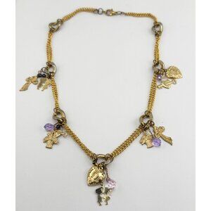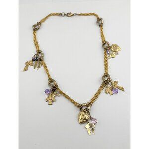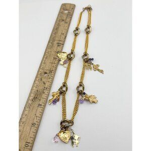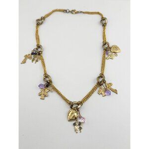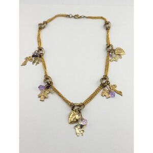 Vintage crystal charm necklace hearts, keys, bows, Flowers, kissing couple. Vintage crystal charm necklace. Gold tone chains with hanging crystals and gold tone charms. Vintage necklace with heart closure. MN54MN.