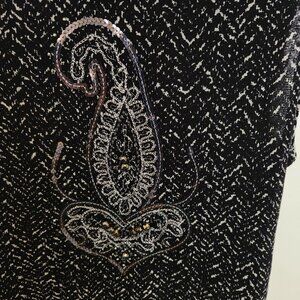 Sheer fabric with sheer lining. Hand sewn sequins and metal prong glass, crystals.