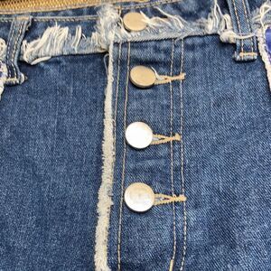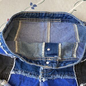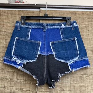 Vintage custom jean patchwork short shorts raw edge 2.5” inseam 11” rise 15” side to side at waist