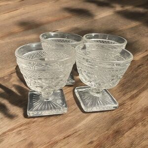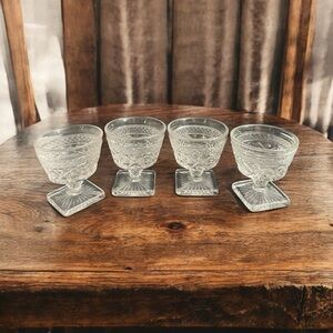 This listing is for a set of four (4) footed sherbet bowl produced by Imperial Glass in the popular Cape Cod Clear pattern. All the sherbets are in excellent condition and are free of chips and cracks. The sherbets measure 4” T x 3.75”W.
