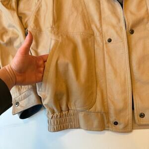 Vintage 1990s d.FINE Las Vegas leather bomber jacket. Tan genuine leather with navy leather collar trim and a bold multicolor abstract satin lining. Men’s size 42 (fits like a Large). Zip front with snap buttons, elastic hem, and two hand pockets. Pre-owned and in great shape with normal light wear. See photos and measurements.