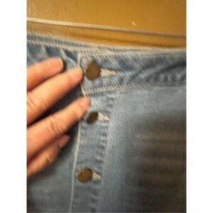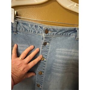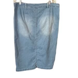 Vintage d.Jeans size 16 button front denim pencil skirt pre faded. This has stretch 82% cotton, 17% polyester and 1% spandex. Top of skirt side to side 19” and length 29”.
