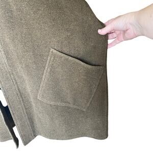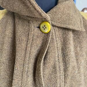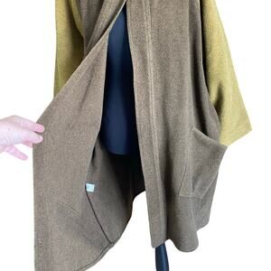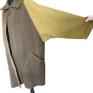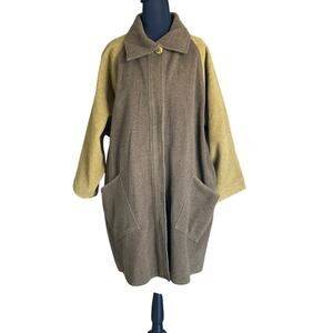 Rare vintage da Venezia wool blend coat, made in Italy. Features a rich brown body with contrasting olive sleeves, oversized patch pockets, and minimalist button closure at collar. Boxy, cocoon-inspired silhouette with an art-to-wear vibe. Fully lined, high-quality construction.