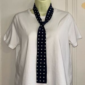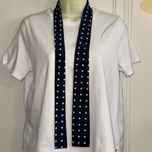 Vintage dark navy blue thin, long polyester scarf with white polka dots