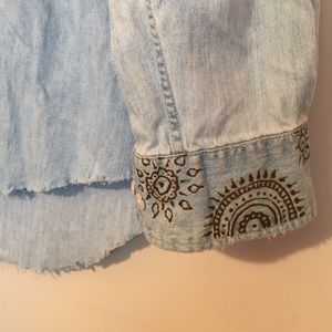 Vintage distressed denim button down shirt with hand painted henna designs on bottom of both sleeves