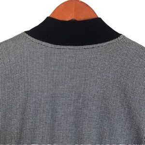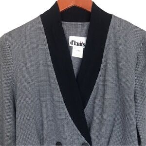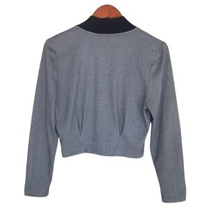 Vintage, d’knits, Double Breasted, Long Sleeve, Cropped Blazer Jacket. Black with tiny houndstooth like dots. Ribbed black collar. 2 front button closure. Pleated back detail. Front button closure. Light weight, 50% polyester 50% cotton. Made in the USA. Side small. See photos for measurements to ensure fit.