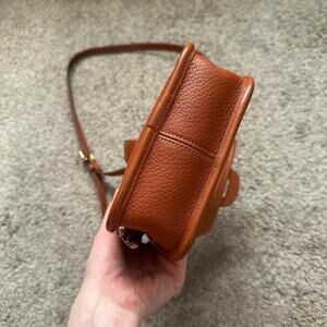 brown leather, gold hardware, crossbody bag, vintage accessory, coin purse, charm accents, phone pocket, structured design, preowned purse, retro style