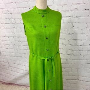 Bright green sleeveless maxi dress with button-down front and waist tie.