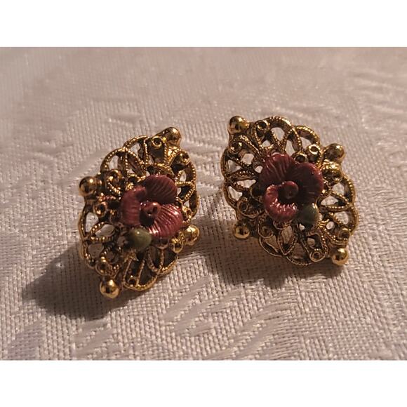 Add a touch of vintage charm to your jewelry collection with these beautiful gold-tone earrings. Featuring a delicate filigree design and a lovely mauve-colored rose, these earrings are perfect for adding a touch of elegance to any outfit.