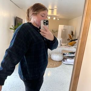 Super cute navy and dark green Eccobay pullover with beautiful vintage buttons. It doesn’t have a size but I would say S/M oversized. I wear a 10 and I’m modeling in the last pictures