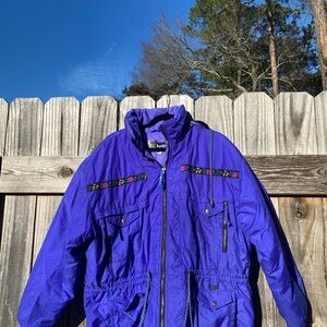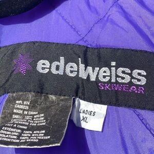 A vintage Edelweiss ski jacket in wonderful condition. Features vibrant purple color with floral style finishing ribbon embellishments and matching braided cording. The hood is detachable and there is a waist pull