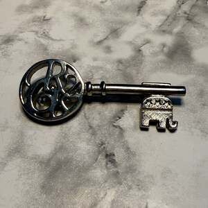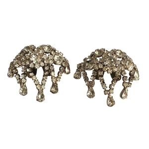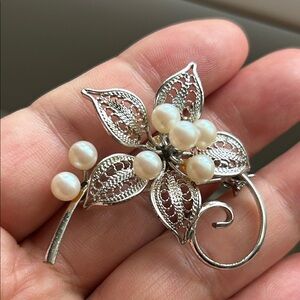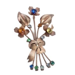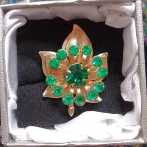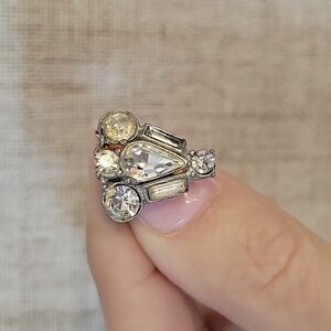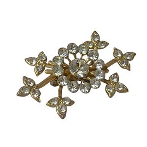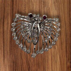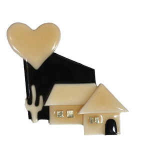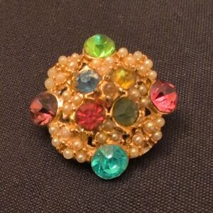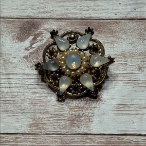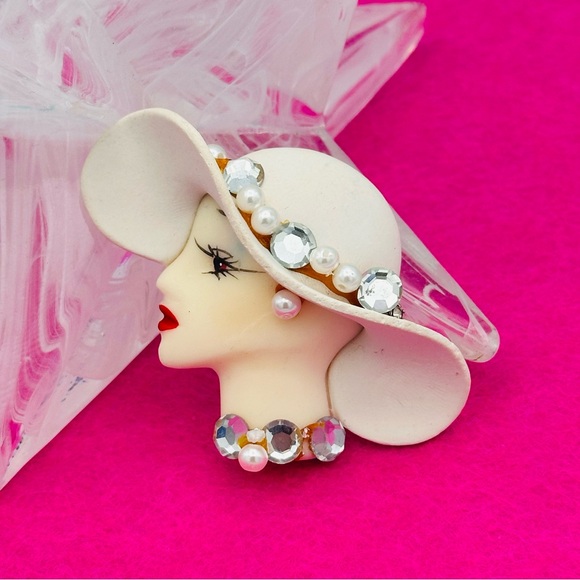 This elegant brooch features a stylish lady head with a white hat adorned with faux pearls and sparkling acrylic crystals & rhinestones.