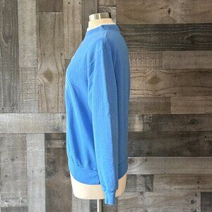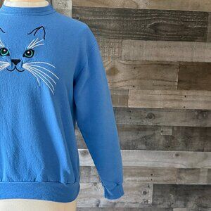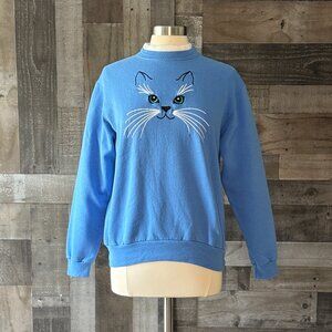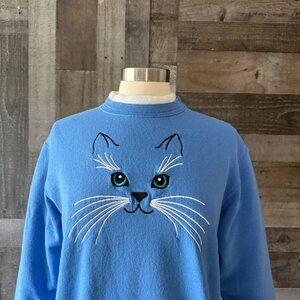 This Top Stitch sweatshirt is blue with a white mock neck. An adorable cat face is embroidered on the front with rhinestone eyes. It is gently worn and is in excellent condition!