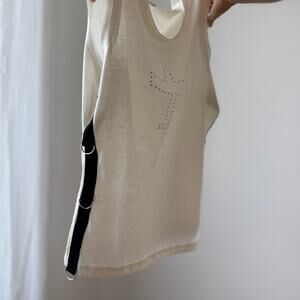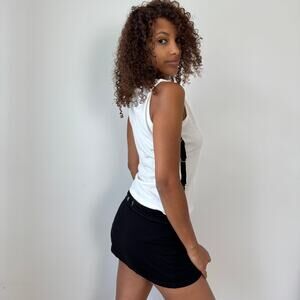 White cotton sleeveless tank with a rhinestone airplane motif at center and contrast black side panels finished with D-ring strap details. Slim, slightly boxy fit. Perfect styled grunge or Y2K. Hand sourced in Europe. Free shipping on bundles <3