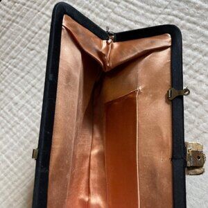Vintage evening clutch / purse black satin with golden clasp and a pale orange satin lining.