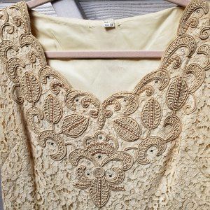Vintage ivory dress originally worn in a wedding as maid-of-honor but could be used for any dressy occasion with its intricate applique design. Lined, size tag says 18, but it was altered on the front and back darts so is closer to an 8-10 now. Tea length, mid-shin.