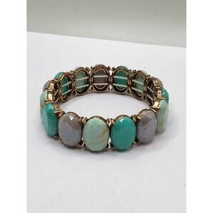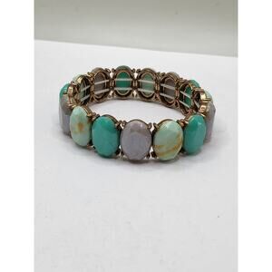 Vintage faceted oval glass stretch bracelet featuring alternating turquoise, gray, and pale green marbled stones in gold tone settings. Beautiful color contrast with a mid-century style design.