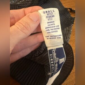Vintage pleated micro-cami by Colesce Couture, made in the USA. Black with metallic abstract swirls, stretch lace trim, and adjustable-length spaghetti straps. Tagged size Small, best for XS–S due to slim 13” pit-to-pit fit. Features stretchy micro-pleated fabric with lettuce hem.