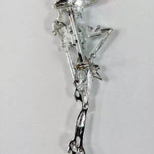 vintage-style lapel pin or brooch features a stylized depiction of a fashionably dressed lady in a dramatic pose, rendered in a polished silver tone. It's a unique accessory that evokes classic elegance and flair.